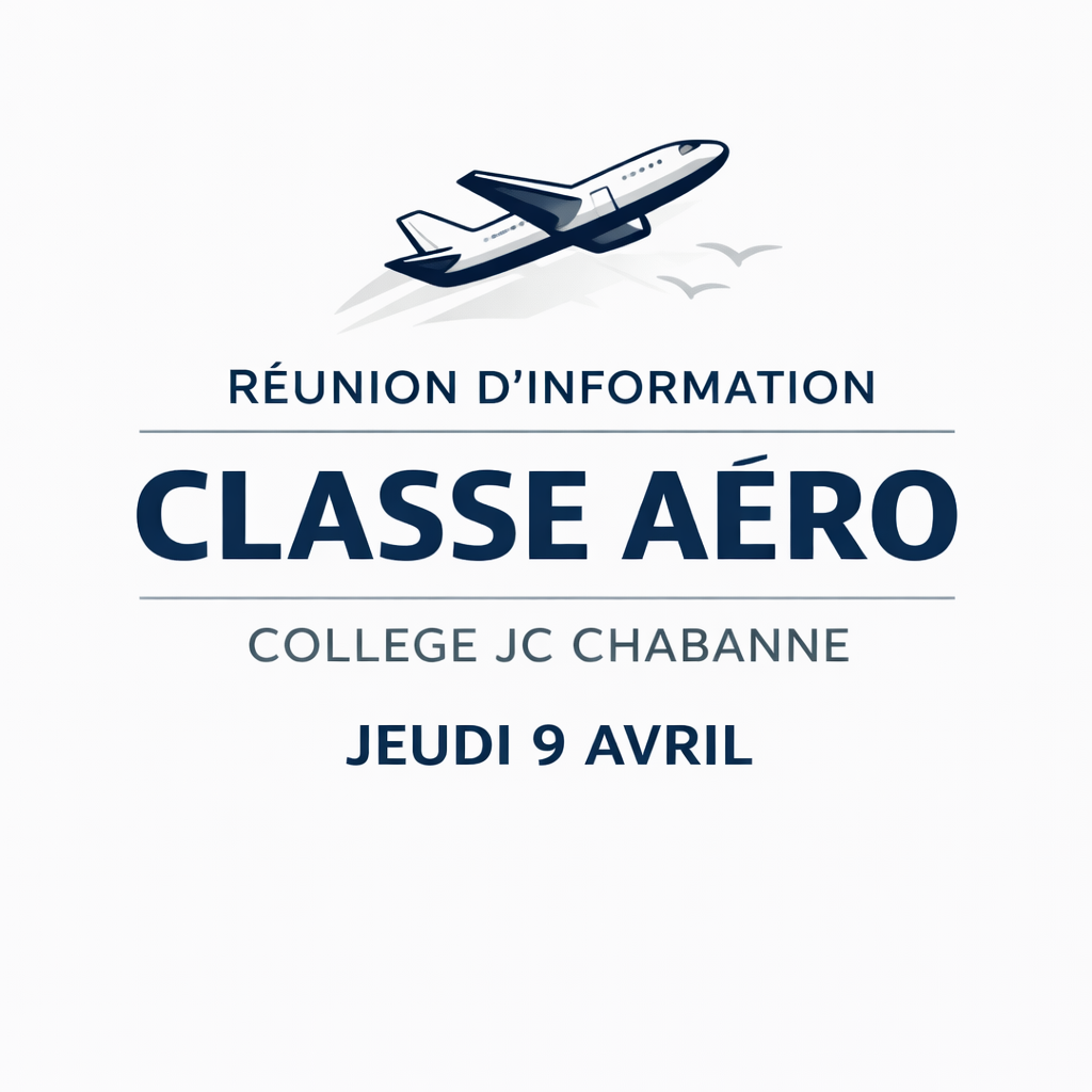 Vous souhaitez en savoir plus sur la classe Aéro du collège Jean-Claude Chabanne ? Une réunion de présentation est organisée à destination des parents d'élèves actuellement en 5e (hors sections internationales britannique et arabe).